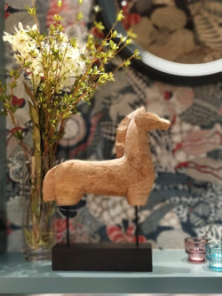An intricately carved wooden jali is aptly fused into the scheme to break the monotony of the straight bold lines.