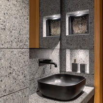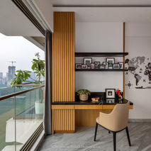 This project embodies a seamless fusion of bold aesthetics and functional elegance. A teal blue wall panel with a concealed entrance door creates a sleek and uninterrupted visual flow, enhancing the sophistication of the space. The soft pink sofa in the living area adds warmth and contrast, balancing the overall color scheme with a touch of vibrancy.